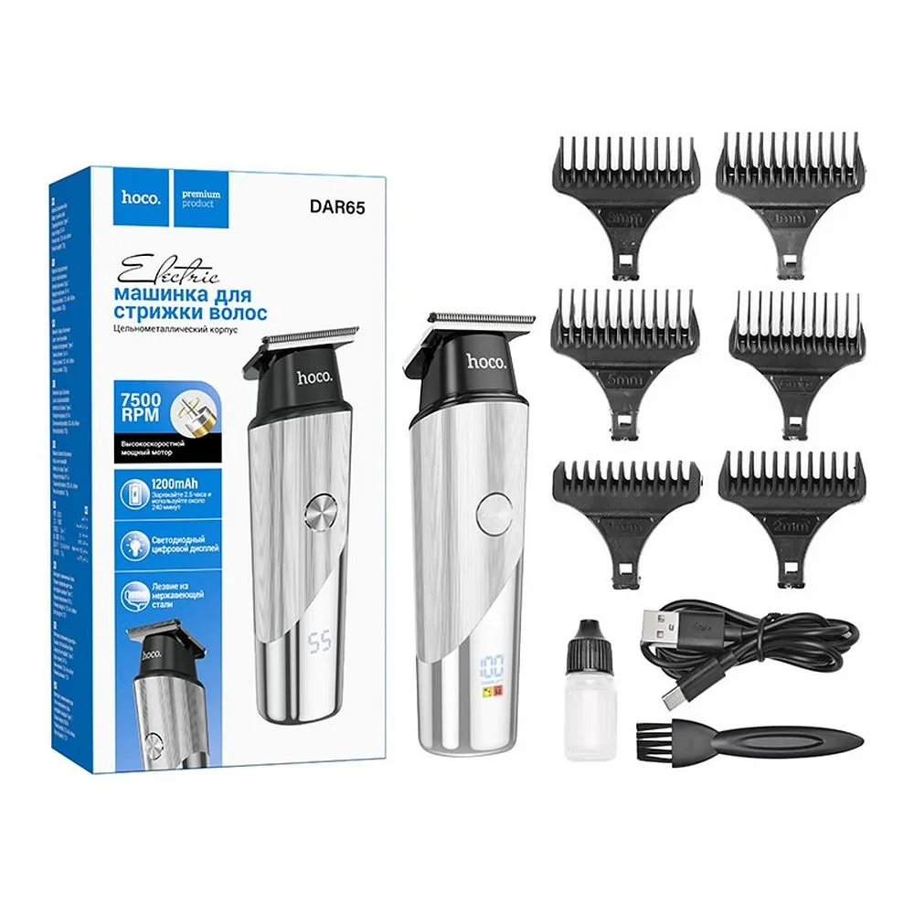 Комплектът включва 6 приставки за регулиране на дължината на подстригване, както и масло, четка за почистване и кабел за зареждане.