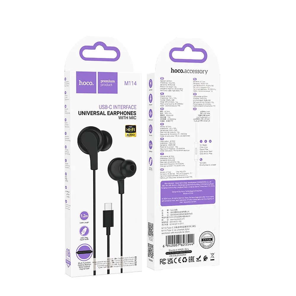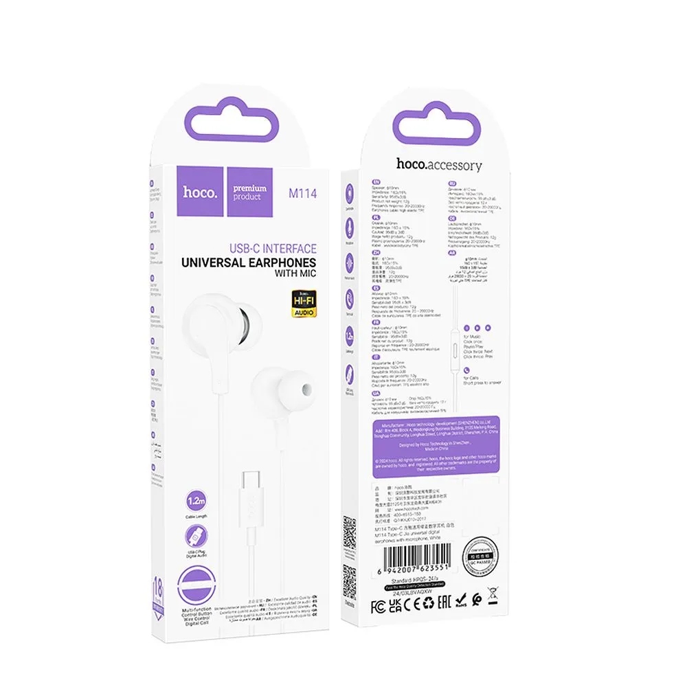 Слушалки Hoco M114 Type C са универсални за поставяне в ушите.